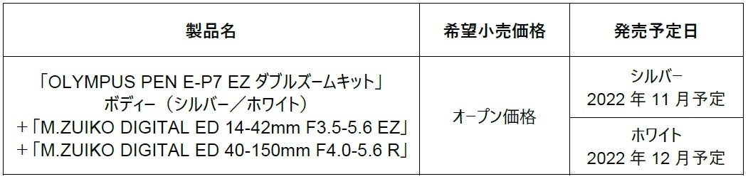 OMデジタルソリューションズ株式会社(代表取締役社長 兼CEO:杉本 繁実)は、シンプルで上質なデザインのミラーレス一眼カメラ「OLYMPUS PEN E-P7」に、薄型標準ズームレンズ「M.ZUIKO DIGITAL ED 14-42mm F3.5-5.6 EZ」と望遠ズームレンズ「M.ZUIKO DIGITAL ED 40-150mm F4.0-5.6 R」の2本を組み合わせた「OLYMPUS PEN E-P7 EZダブルズームキット」を2022年11月(※1)に発売します。カメラと2本のレンズを合わせて重量677g(※2)という軽量なシステムながら「プロファイルコントロール」等の多彩な撮影機能を備え、気軽なスナップから風景やネイチャーまで、さまざまな撮影シーンに応えます。