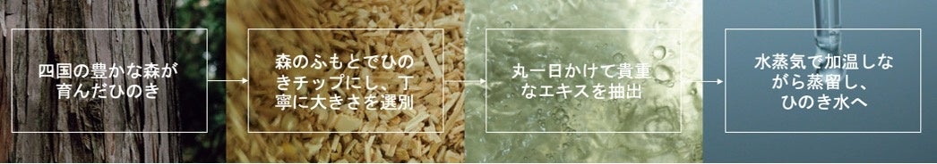 ひのきの幹や枝をチップ化したものから抽出したエッセンスを凝縮し、さらに濾過、蒸留することで得られる貴重なエキス「ひのき水*」の性質が、理想とする美しくすこやかな肌を育むために欠かせない3つの条件と合致することを見出しました。