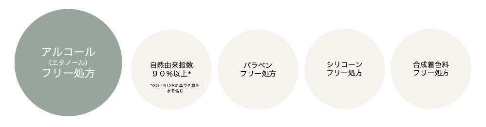 旧製品から引き続き、自然由来指数90%以上*、パラベン(防腐剤)フリー、シリコーンフリー、合成着色剤フリー処方に加え、ご要望を多くいただいていたアルコール(エタノール)フリー処方が新たに加わりました。