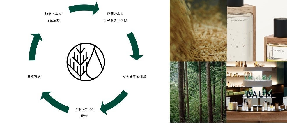 新樹木成分「ひのき水*」として、特別提携する四国地方の豊かな森林*1で育った「ひのき」から抽出した「ひのき水*」のみを使用。また苗木を店頭で育て、四国地方に位置する「BAUMひのきの森*2」で植樹活動を行うことによって、サステナブルな循環を生み出す活動に取り組んでまいります。