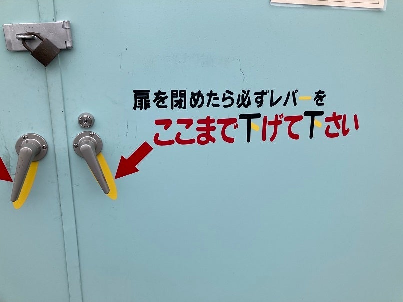 定温倉庫の扉を閉める際、しっかりレバーを下げることで隙間無く閉められ、倉庫内の温度が一定になりますが、きちんと閉められていることがなかったため、直接注意喚起を扉に貼りました。