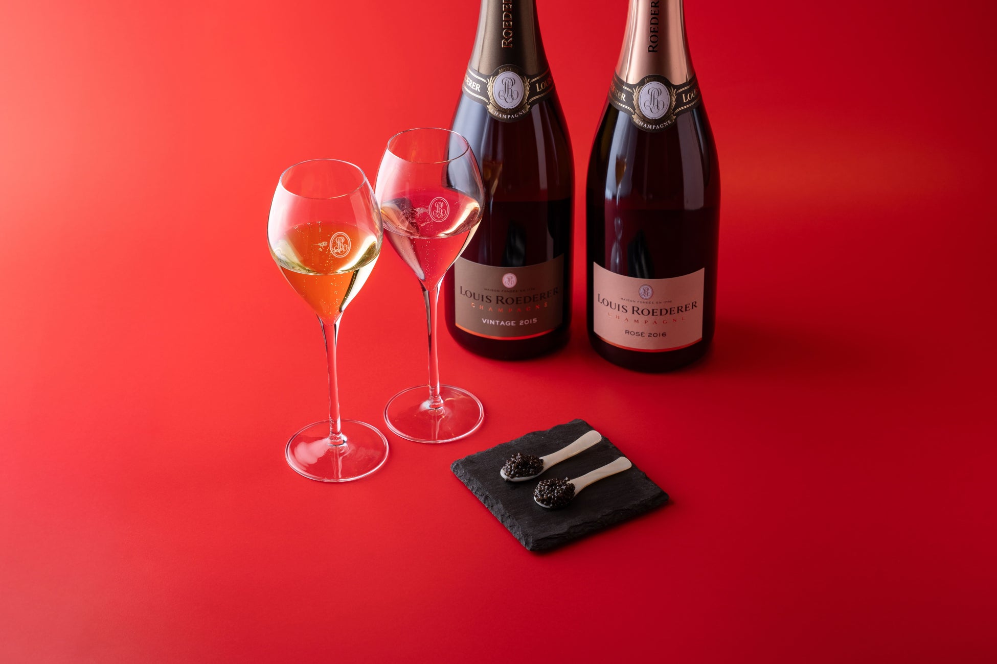 フランス産のフレッシュキャビア2スプーンと、世界最高峰の老舗シャンパーニュ・メゾン「ルイ・ロデレール」の上級キュヴェ白&ロゼ2杯のペアリングセット。