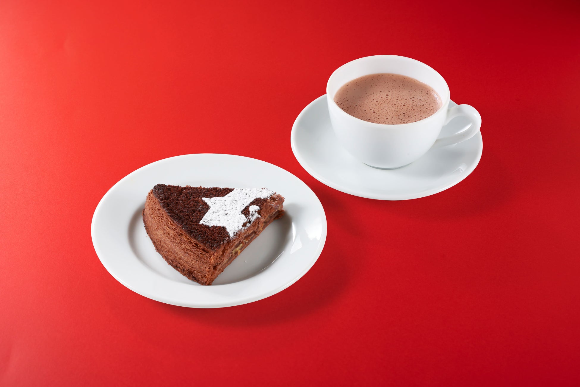 カメルーン産カカオとオレンジを合せたアーモンドクリームに、ペルー産カカオを使用したクリームを重ね、風味豊かなパイ生地で包み香ばしく焼き上げた「ガレット デ ロワ カスパール」とお好みのドリンク(ショコラ ショ パリジャン、ショコラ グラッセ、紅茶、コーヒー、ネクター)のセットメニューです。
