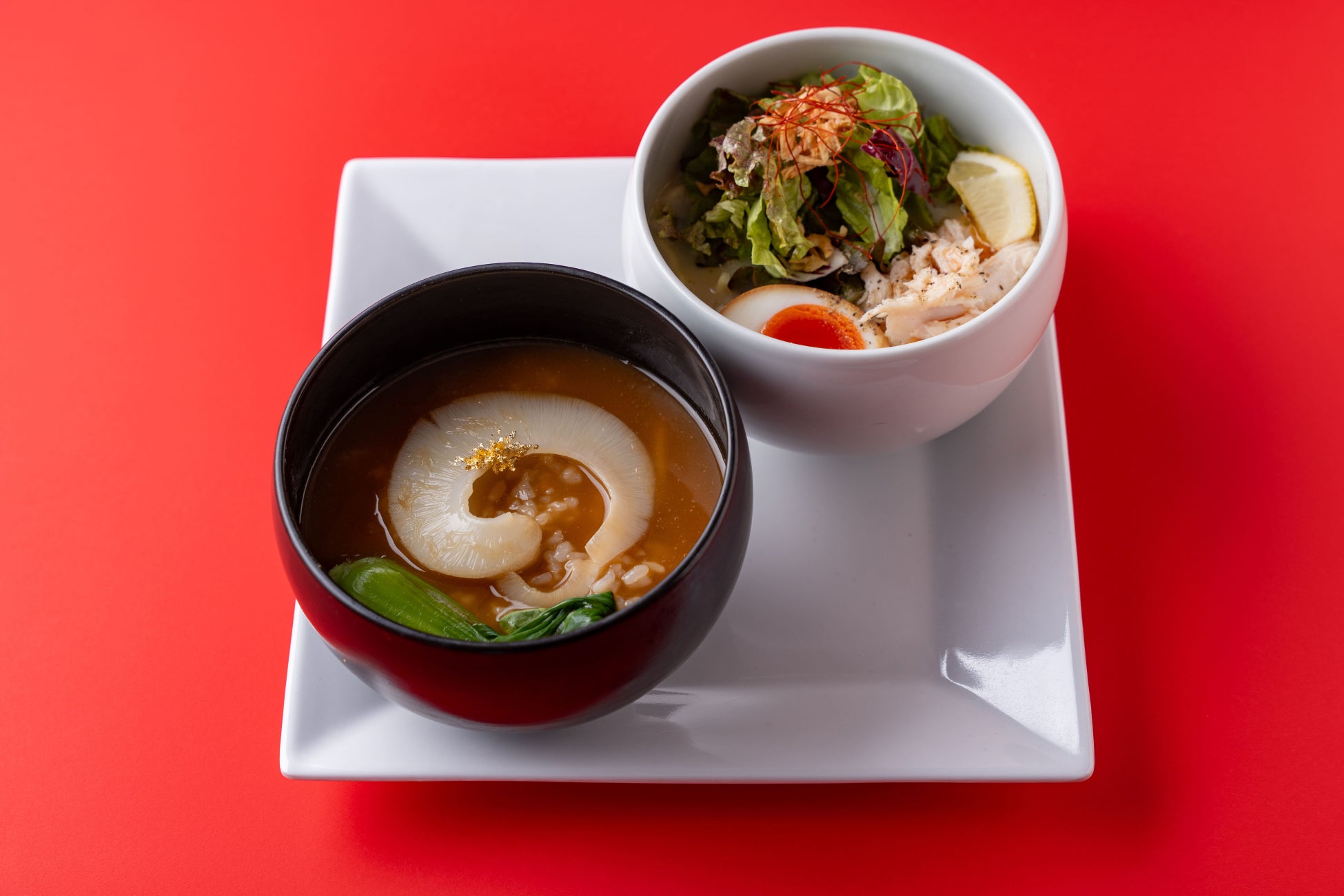 ヨシキリサメのフカヒレ姿を使用したフカヒレ姿煮あんかけご飯ハーフサイズと、鶏白湯塩そばのハーフサイズをセットにしたセットメニューです。