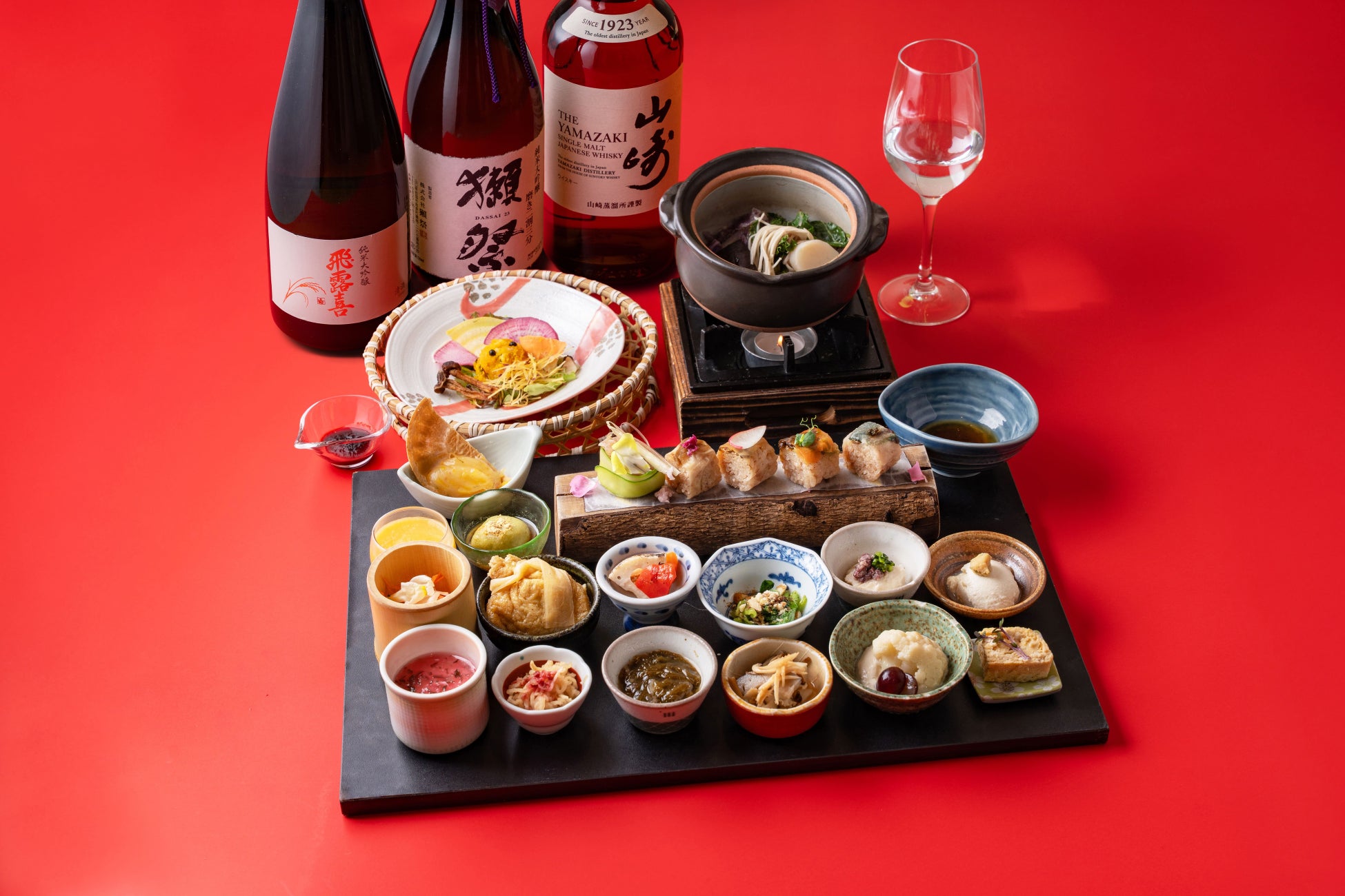 お野菜寿司五貫や小鍋、旬の小鉢十数種で構成された、美と健康がテーマの「うつくしの御膳」に、獺祭・飛露喜・山崎より選べる銘酒一杯を特別にお付けした、新年を祝う豪華セットです。