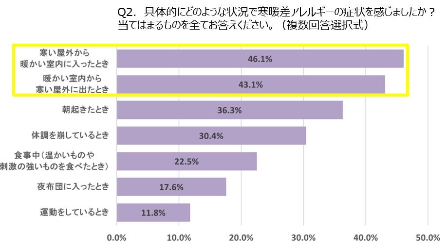 また、「朝起きたとき」「食事中」と回答した方も多く、日常生活の些細なことでも、『寒暖差アレルギー』の要因となる可能性がうかがえます。