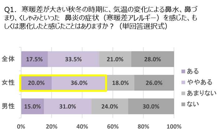 当社が行った調査では、約5割の方が寒暖差が大きい秋冬の時期に鼻炎の症状を感じたことがあると回答しており、多くの方が寒暖差アレルギーを経験していることがわかります。また男女別では、実感したと回答した女性の割合が56.0%となり、男性よりも10%も多い結果となりました。女性の方が特に『寒暖差アレルギー』の症状を感じやすい傾向にあることがうかがえます。
