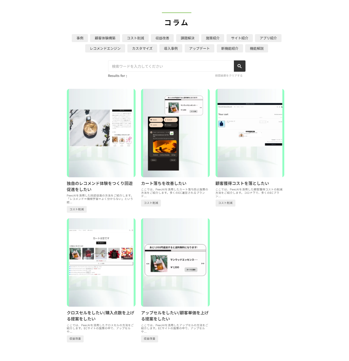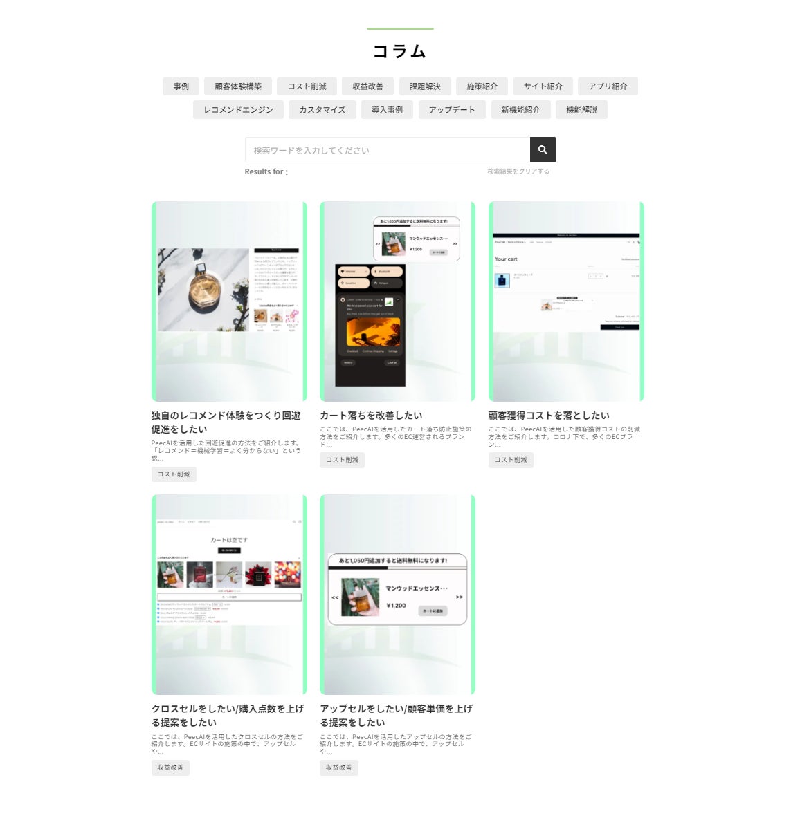 パーソナライズレコメンドエンジン『PeecAI』は、ブランド(マーチャント)様向けに課題発見ページを作成し、より効果的に製品をご利用を頂けるページ( https://lp.peec-ai.com/column )を公開いたしました。