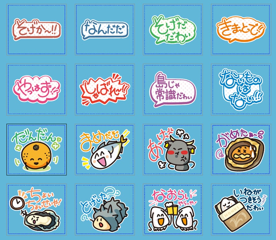 島内外関わらず幅広い世代が親しめるよう、スタンプのコンセプトは「ゆるい・かわいい・カラフル」とし、海士町の特産品をモチーフにしたスタンプ8種と、吹き出しタイプ8種の計16種のスタンプが完成しました。LINE STOREのクリエイターズスタンプとして販売を開始しました。