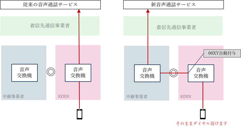 本サービスをご利用いただくことにより、KDDI側交換機により00XY番号が自動的に付与されるため、エンドユーザー様は専用アプリの使用や00XY番号を入力して電話を発信する必要がなく、利便性の高い音声通話サービスをご利用頂けます。