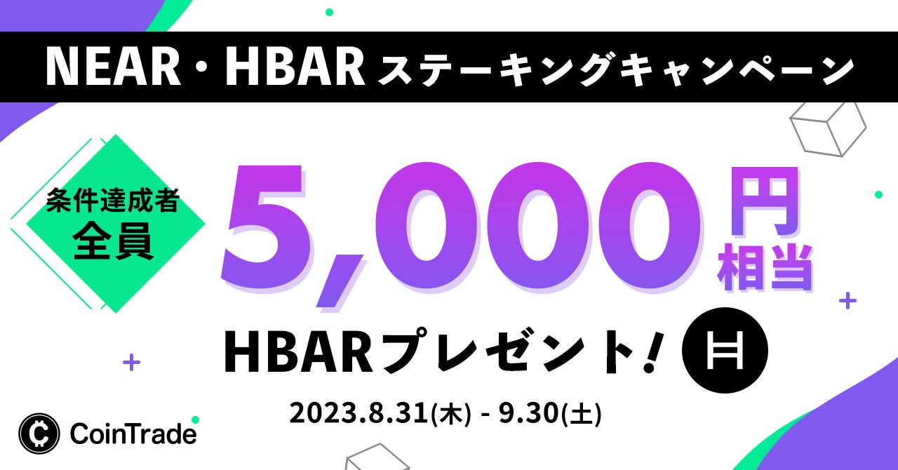 また、「CoinTrade(コイントレード)」はニアプロトコル(NEAR)、ヘデラ(HBAR)ステーキングサービス開始を記念して、条件達成者全員に5,000円相当のヘデラ(HBAR)をプレゼントするキャンペーンを開催いたします。
