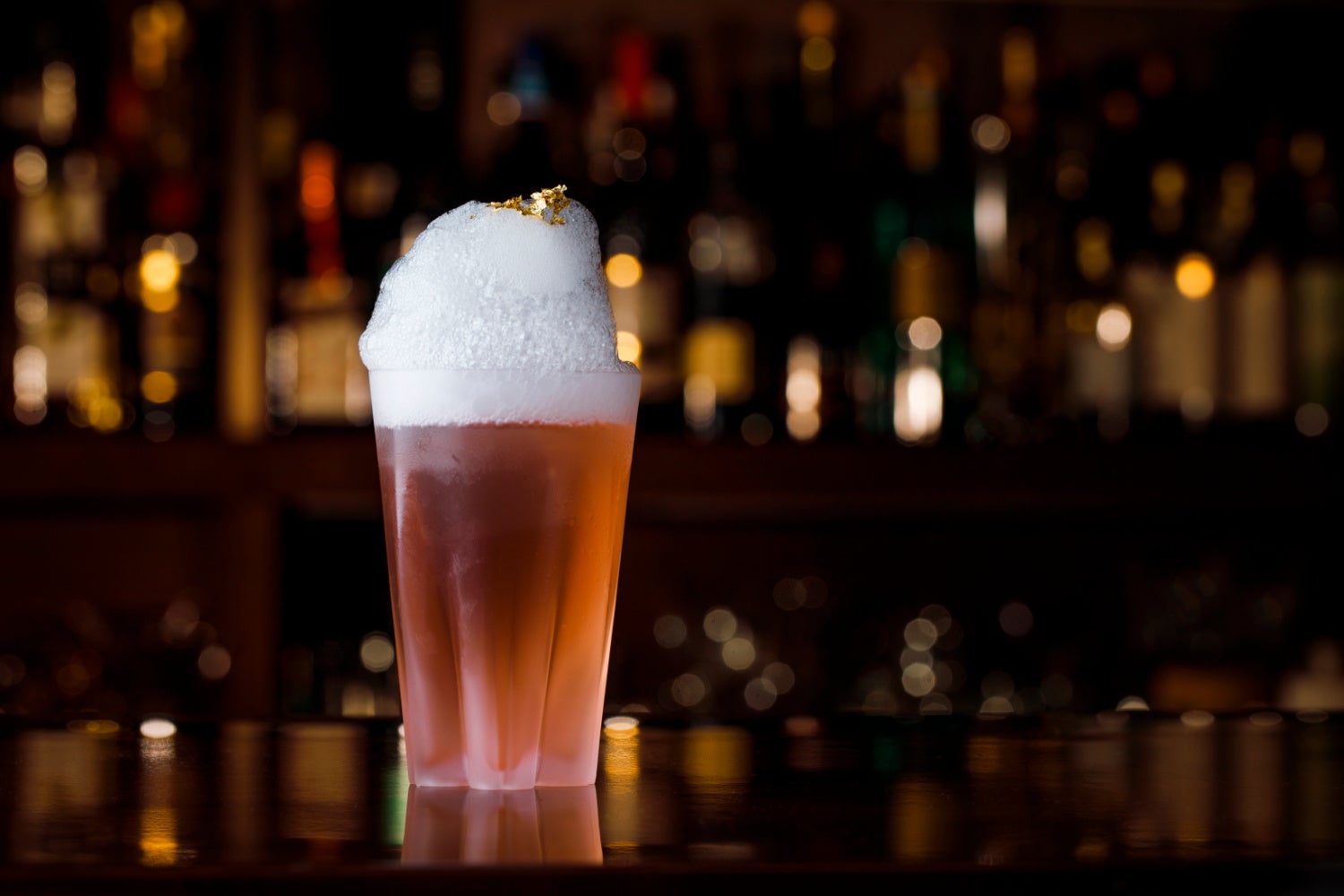この春、ヘッドバーテンダー高橋 司が提案するスペシャル・カクテルは、狩野画として知られる「吉野図屏風」(狩野常信作)の八重桜をヒントに現代作家が手掛けた「吉野の桜と金鶏鳥」からインスピレーションを得て、華やかな桜と金箔の雲間を表現しました。
