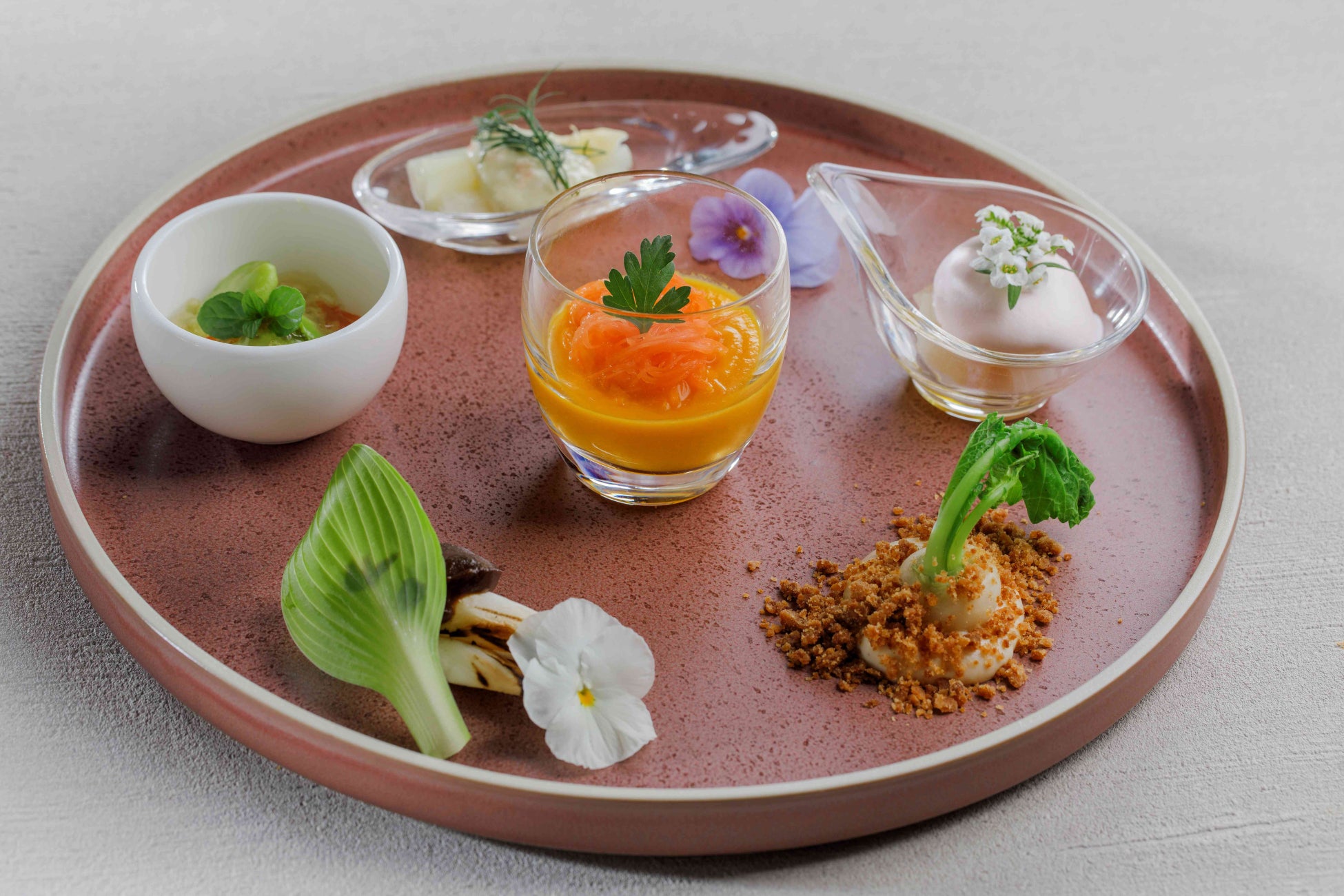 ウェルネス・ディナーコースは、ウェルネスフード・コンシェルジュ監修の下、たんぱく質や糖質バランスを考えながら、料理長 北島が構成します。フレンチの技法を用いつつ、北島が得意とする発酵技術も取り入れたソース使いや食材へのアプローチは、当ホテルのシグネチャーである“ウェルネスキュイジーヌ”としての完成度を高めます。