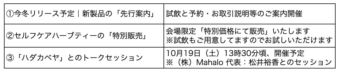 この展示会では、mycy|マイシーの【新製品を初披露と試飲】が体験できるブース、【会場限定価格】セルフケアハーブティーの試飲や販売を行います。