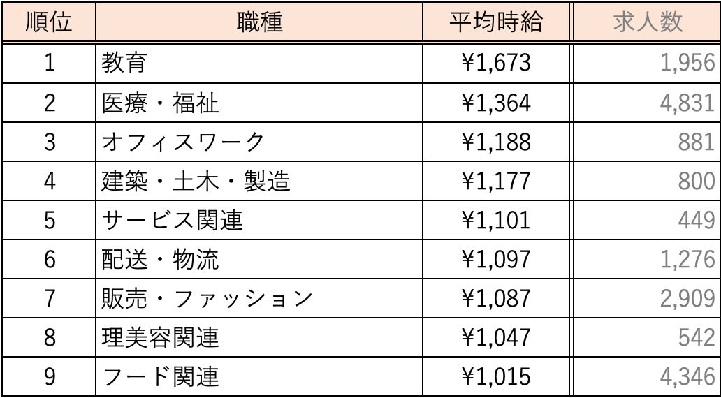 「医療・福祉」の求人が2番目に平均時給が高い職種となったが、「薬剤師・登録販売者」の平均時給が2,093円、「看護師・准看護師」が1,625円と平均時給を底上げした。どちらも500件以上の求人があるため、ニーズは高い。最も求人数が多い「ヘルパー・介護」では平均時給が1,277円と県の平均よりも高くなった。
