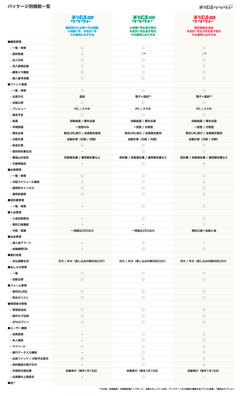 『不特法クラウド』は、面前のみからクラウドファンディングまで、事業者の導入フェーズや事業規模に合わせた3つのプランをご用意しています。