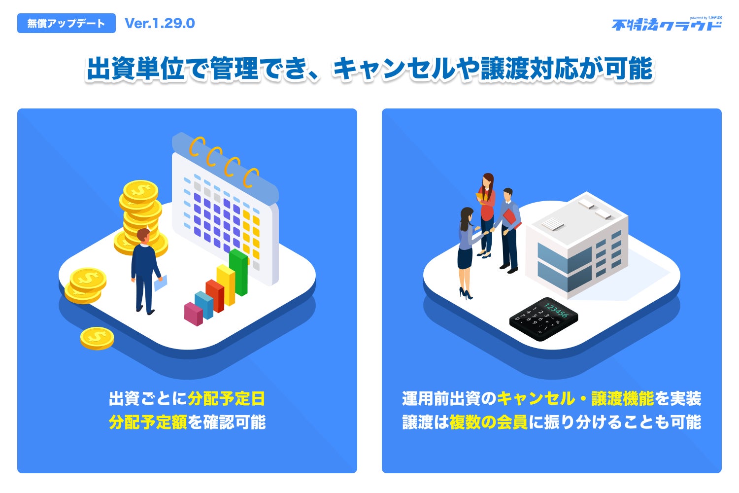 ver1.29では、新たに出資管理機能を追加。出資管理機能では、出資ごとの分配スケジュール・分配予定額を確認できるほか、運用前のキャンセル・譲渡手続きが管理画面上で行えるようになりました。
