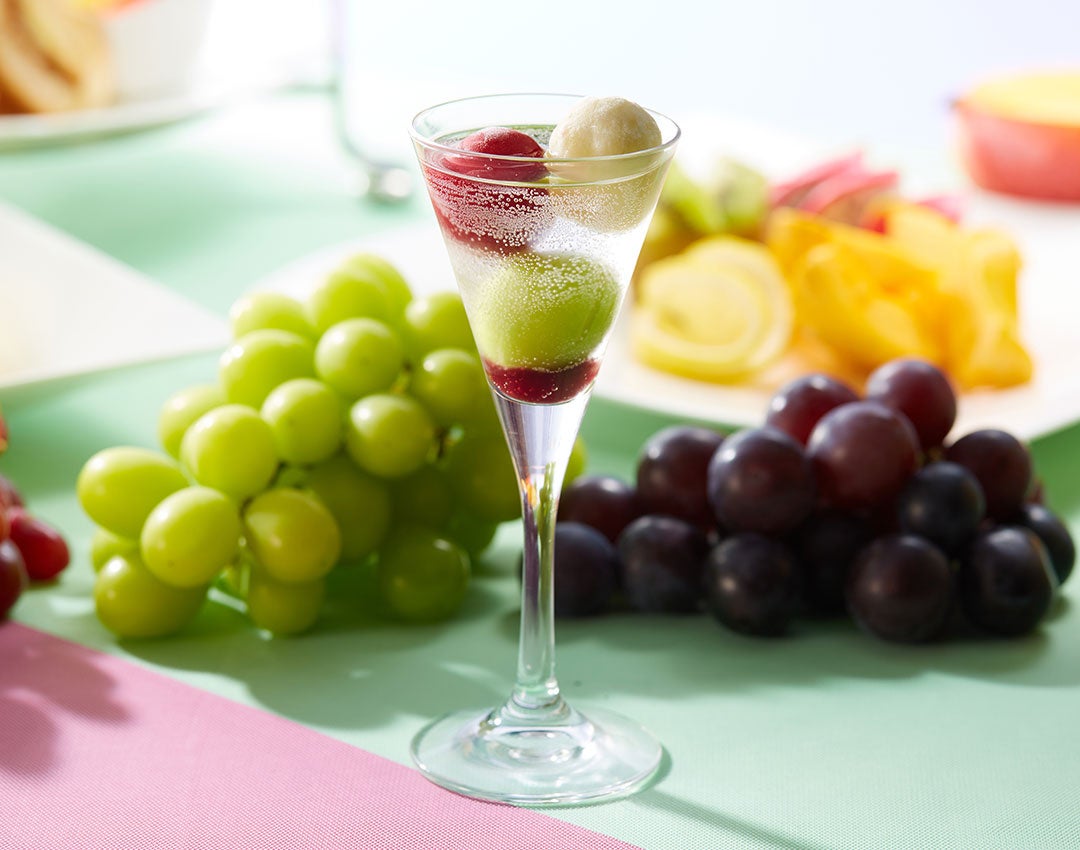 平日4:30pm以降は限定メニューとして「スパークリングドリンク~ぶどう~」をご提供いたします。凍らせたシャインマスカットやピオーネを炭酸水に浮かべたドリンクです。