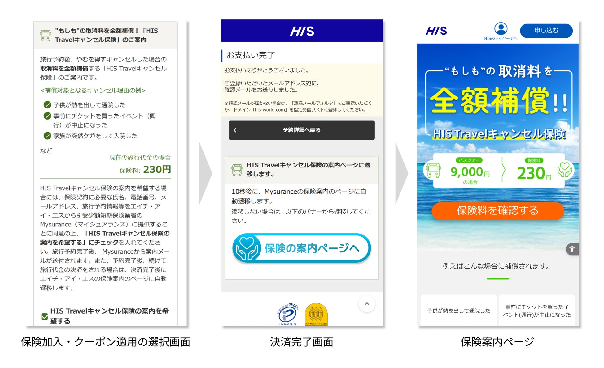なお、HISサイトにてバスツアーをご予約のお客さまは、保険加入・クーポン適用の選択画面で、国内の宿泊・航空券※2をご予約のお客さまは、予約内容確認画面でキャンセル保険の案内を希望し、情報連携に関する同意のチェックをいただくと、旅行手配の予約完了後に「HIS Travelキャンセル保険」の案内ページへ自動遷移します※3。キャンセル保険申込みに必要な旅程や旅行者の情報がシームレスに連携しており、スムーズにご加入いただけます。