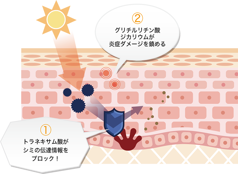 日焼けによる刺激を鎮めるグリチルリチン酸ジカリウムとトラネキサム酸。