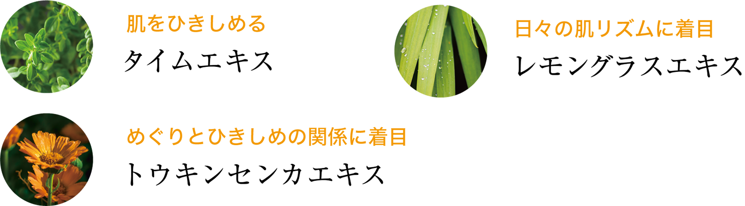 タイムエキス・レモングラスエキス・トウキンセンカエキスが、マッサージと併用することでお肌をひきしめハリを与えます。