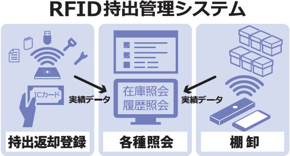 ICタグを活用した持出管理システムです。持出・返却履歴を確実に記録し、台帳への記入漏れや記入ミスを防止するとともに、返却忘れや紛失の早期発見をサポート。さらにRFIDハンディによる一括読み取りで効率的な棚卸を可能にします。
