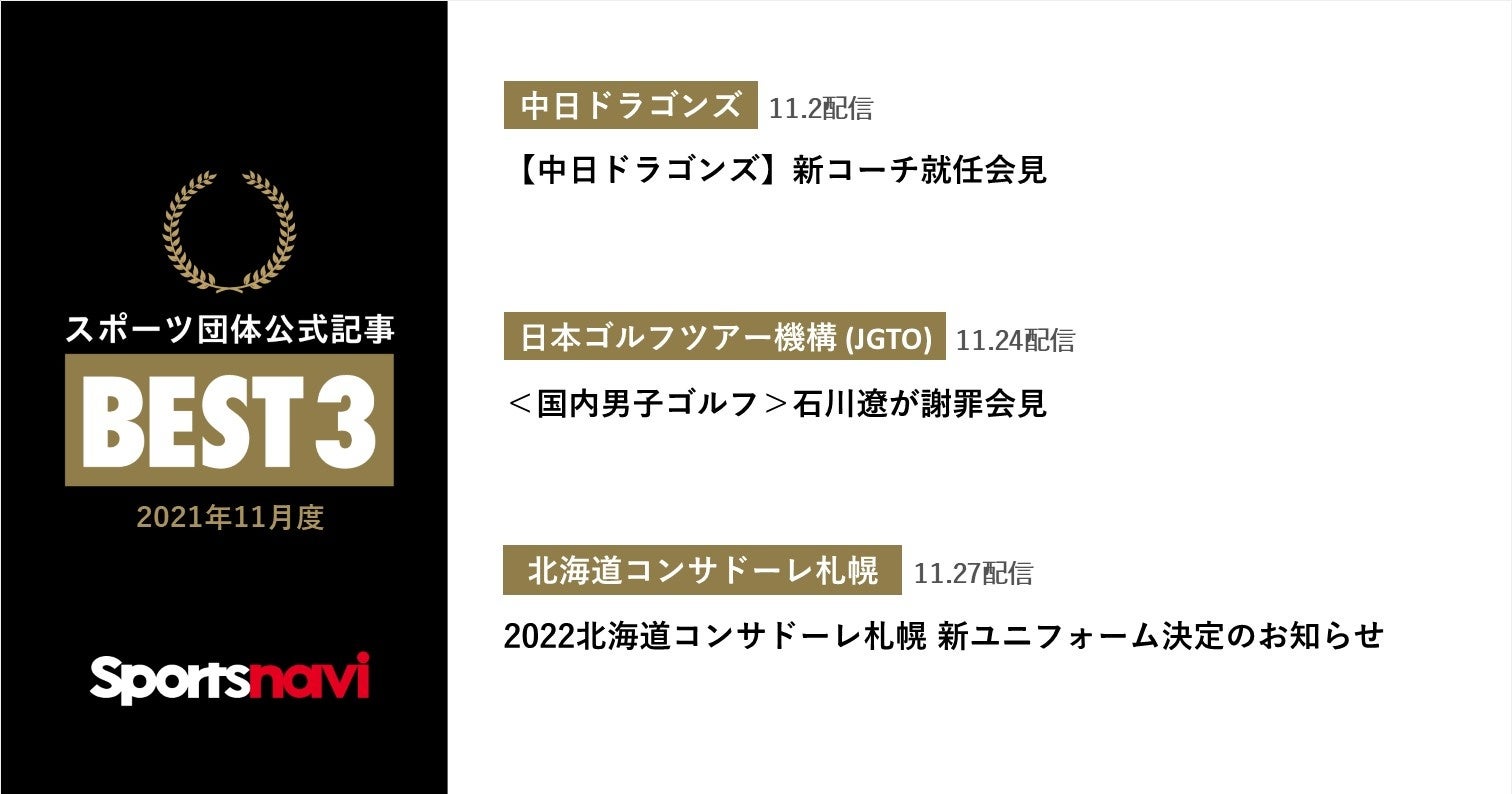 中日ドラゴンズ、日本ゴルフツアー機構 (JGTO)、北海道コンサドーレ札幌が受賞! スポーツ団体公式記事 月間ベスト3(21年11月度)