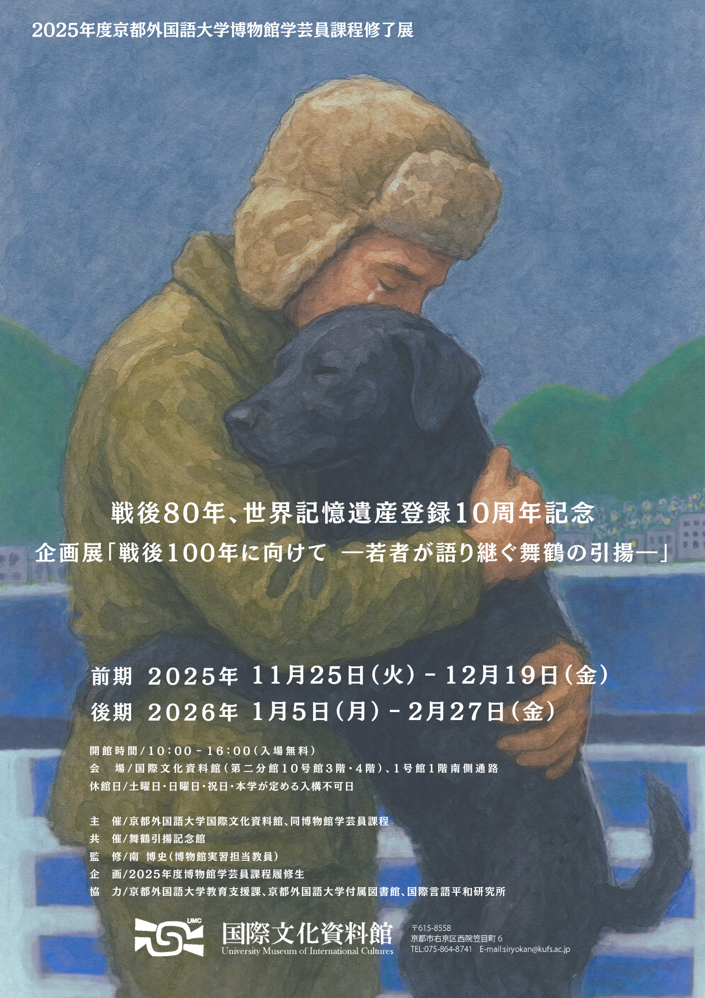 京都外国語大学(京都市右京区 学長:小野隆啓)は、太平洋戦争終戦から80年を迎える節目の年、2025年度博物館学芸員課程履修生が企画・展示を担当する特別企画展「戦後100年に向けて―若者が語り継ぐ舞鶴の引揚―」を開催します。