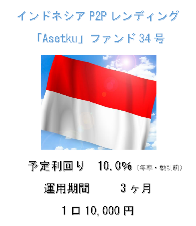 サン・キャピタル・マネジメント株式会社(大阪市中央区、代表取締役社長:前田利和)が運営するソーシャルレンディングサービス「アンシンバンク」は、本日15:00よりインドネシアP2Pレンディング「Asetku」ファンド34号・35号の募集を開始いたします。