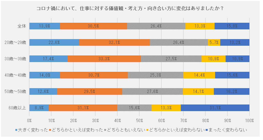 コロナ禍で約半数が仕事に対する価値観に変化があったと回答。コロナ禍の変化はネガティブな面だけとは限らない結果に。