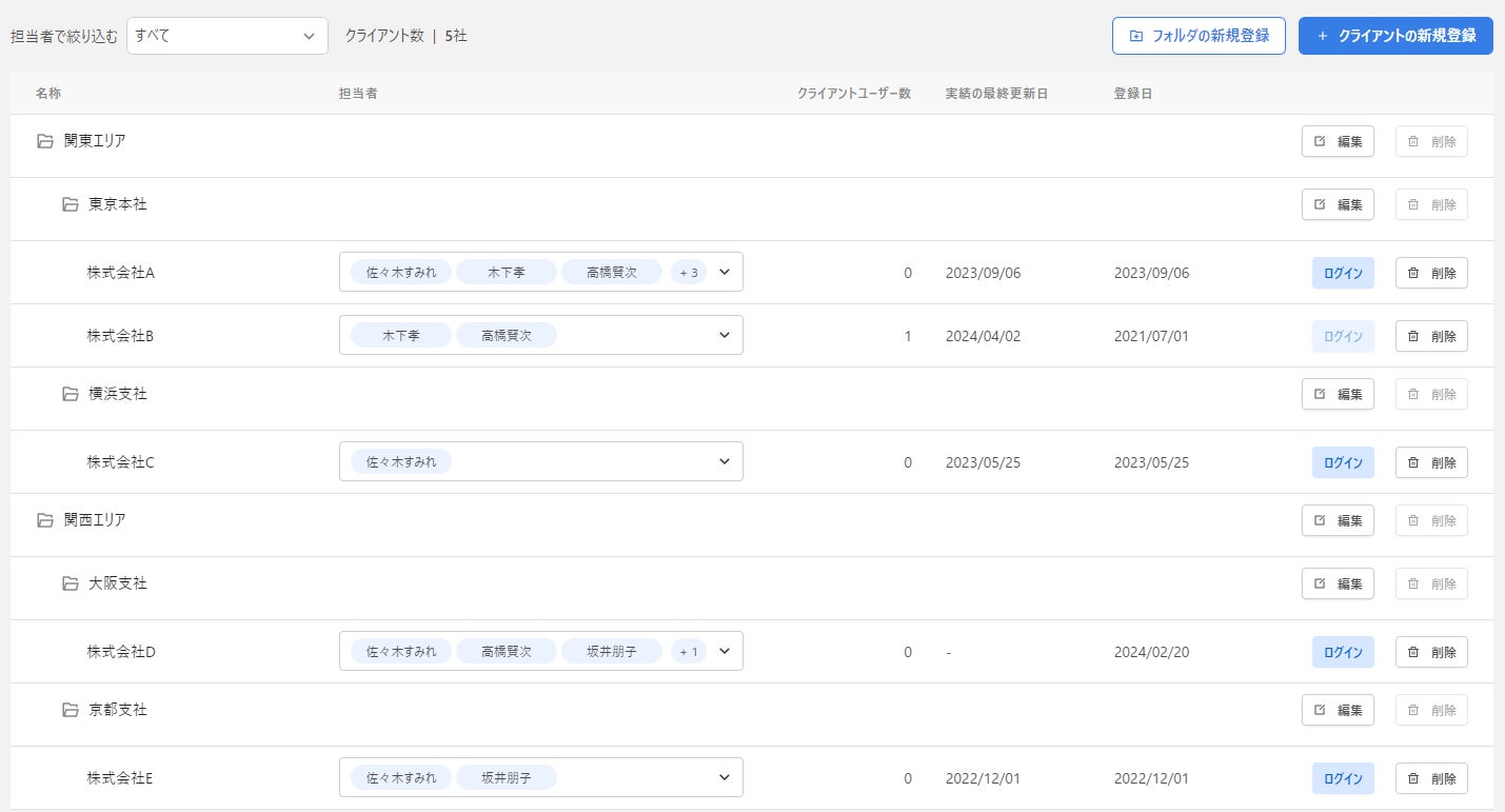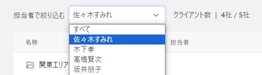 一覧画面から、担当者ごとにクライアントを絞り込むことができます。また、クライアントの総数のほか、担当者ごとのクライアント数も確認できます。