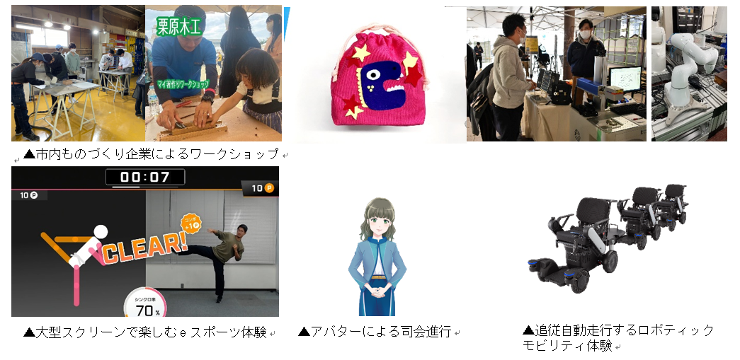 端材を活用したものづくりワークショップ、大型スクリーンで楽しむeスポーツ体験、追従自動走行するロボティックモビリティ体験、VR体験など