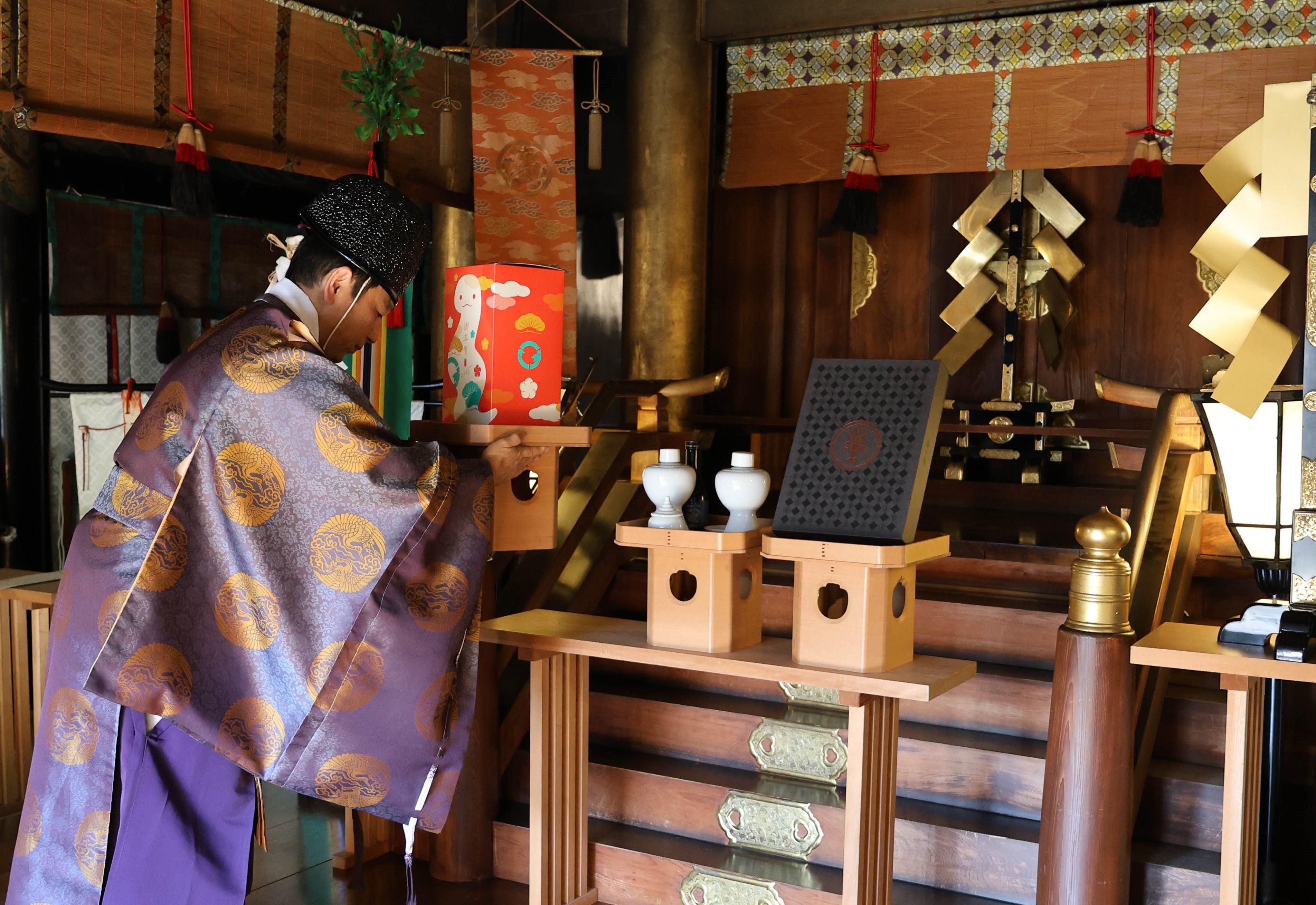 ご祈祷の際に奉納した海老せんべい〈ゆかり〉は、年明けに、名古屋東照宮にて参拝者へお福分けとして振舞われます。