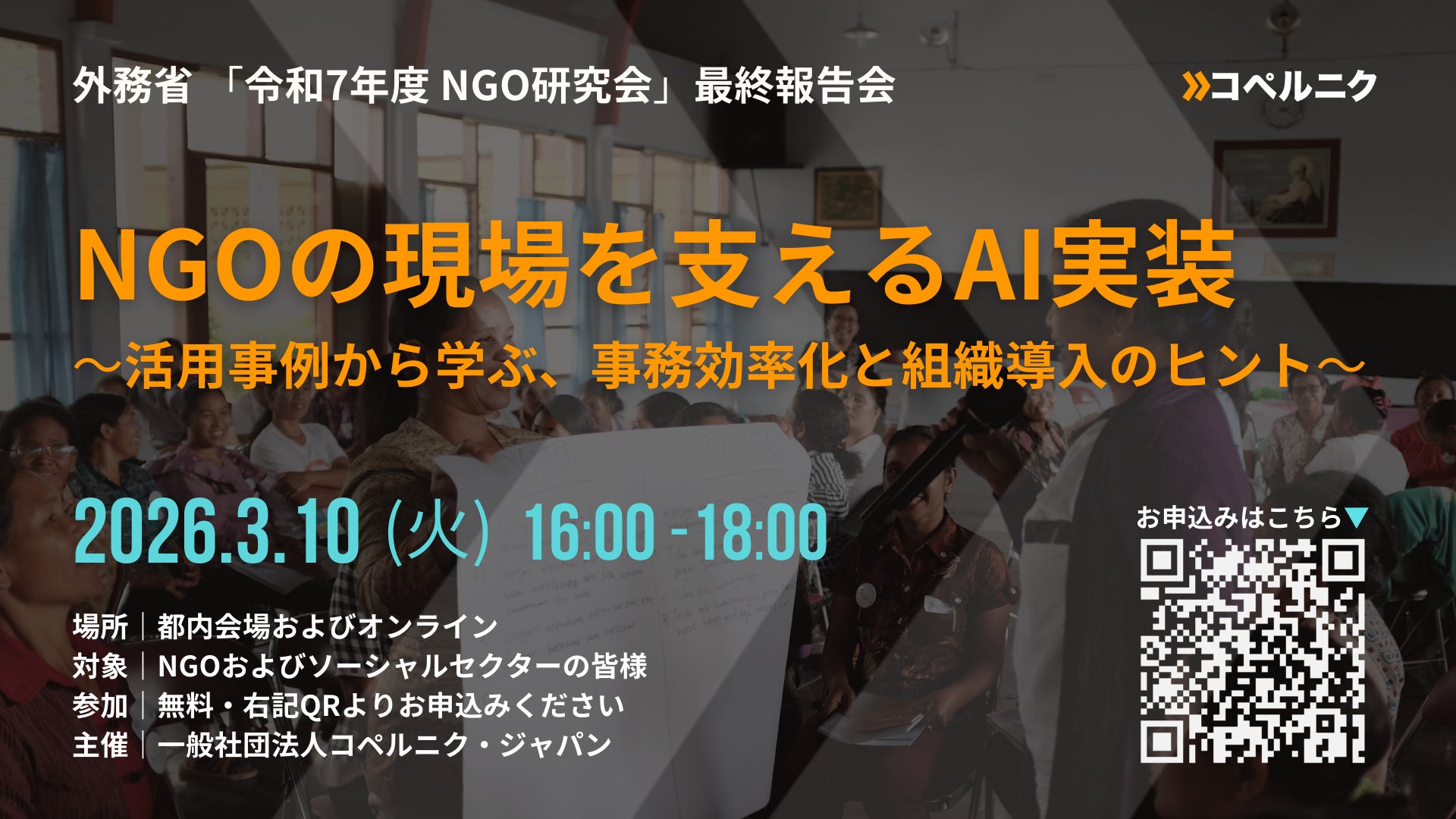 この度、一般社団法人コペルニク・ジャパンは、外務省「令和7年度 NGO研究会」において一年間にわたり実施してきた「国際協力活動におけるAI活用を通じた支援の質と実施能力向上の研究」について、最終報告会を開催いたします。