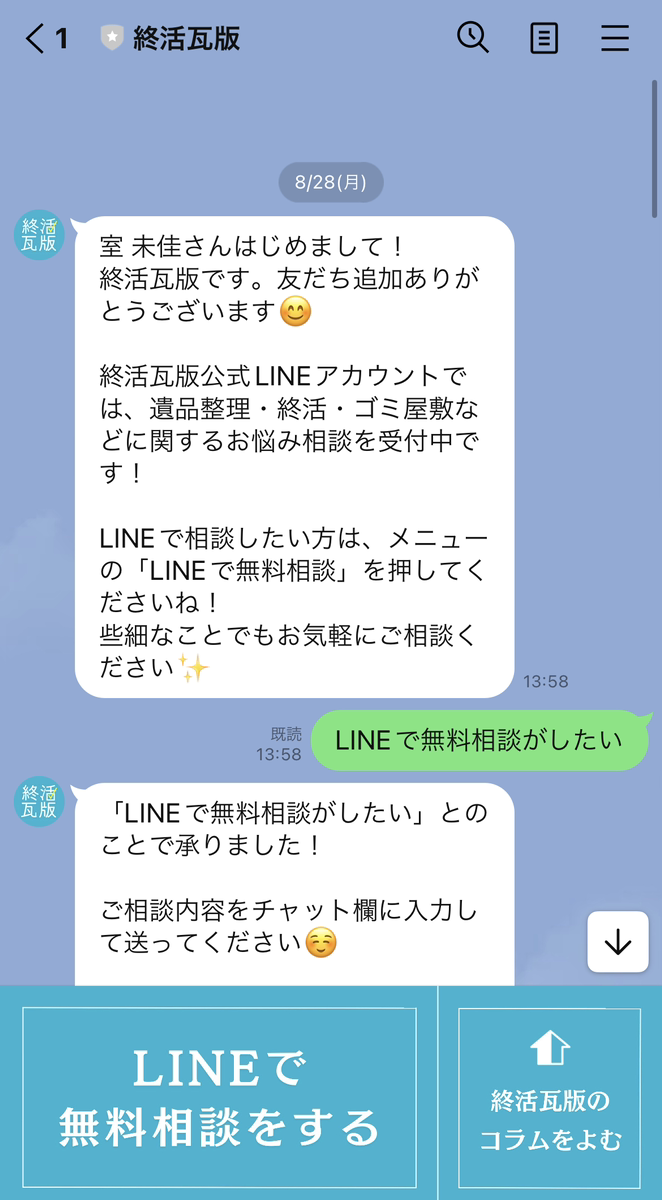 遺品整理をどのように進めていくかのご相談や、終活を行うにあたっての疑問など、LINEでお気軽にご相談いただけます。