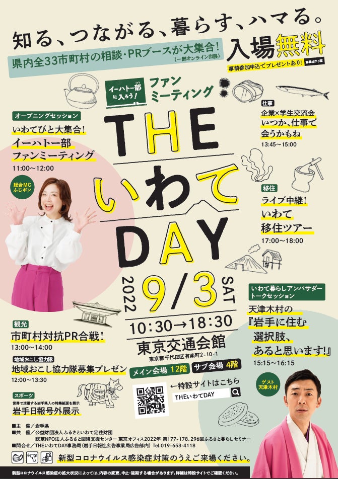 岩手県では、首都圏在住の移住希望者や岩手ファンに対し、暮らしや仕事の魅力を「オールいわて」で発信する移住フェア「THE いわて DAY」を9月3日(土)に東京都内で3年ぶりに開催します。