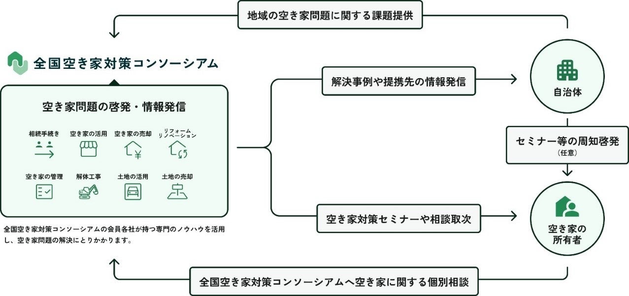 空き家の問題は相続、除却、売却、活用など様々な分野に関連しており、空き家所有者への支援は幅広い専門分野の情報を必要とするため、行政だけでは難しい状況です。そこで、空き家問題を具体的に解決する一助となるべく、核となる協議体として、「全国空き家対策コンソーシアム」が設立されました。独自に専門ノウハウを持つ事業会社がコンソーシアムを形成し、知見を共有することで、各事業者の空き家所有者に対する啓発活動を強化し、具体的な課題解決の促進を目指しています。