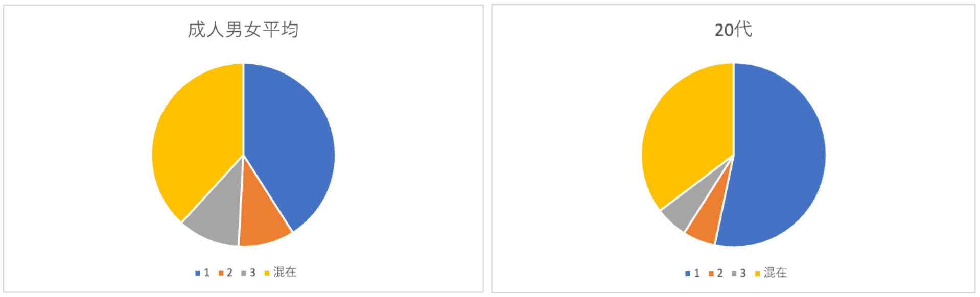 型判定は腸内細菌叢のメタゲノム情報をいくつかのタイプに分類して臨床情報と比較しようという研究から生まれた考え方で、2011年にArumugamらによって提唱された「エンテロタイプ」を基に作成したものです。当社では独自の計算式で、「エンテロタイプ」で最優占種となるバクテロイデス、プレボテラ、ルミノコッカスのいずれかが最優占種と判定された場合に各々1型、2型、3型、そしてそのどれにも該当しない場合は「混在型」とする判定方法を用いて腸内細菌叢を分類しています。今回の解析では、20代から30代に関しては元来日本人に多いと言われていた3型(ルミノコッカスタイプ)と混在型よりも欧米在住者によく見られる1型(バクテロイデスタイプ)の割合が多い結果となりました。特に20代では1型が過半数を超えています。1型は脂肪の多い食生活との相関が見られるタイプです。今まではお肉中心の食生活の方が多いとされていましたが、コンビニ食など脂肪分が多い食事がメインになっている傾向が伺える結果となりました。