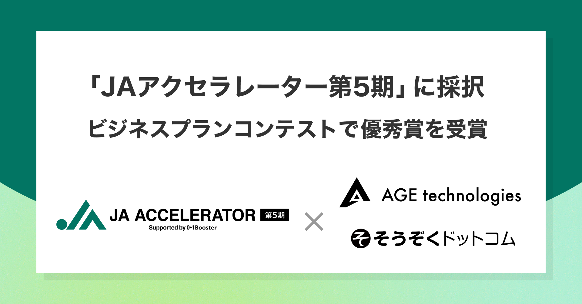 そうぞくドットコムを運営するAGE technologies、「JAアクセラレーター第5期」に採択
