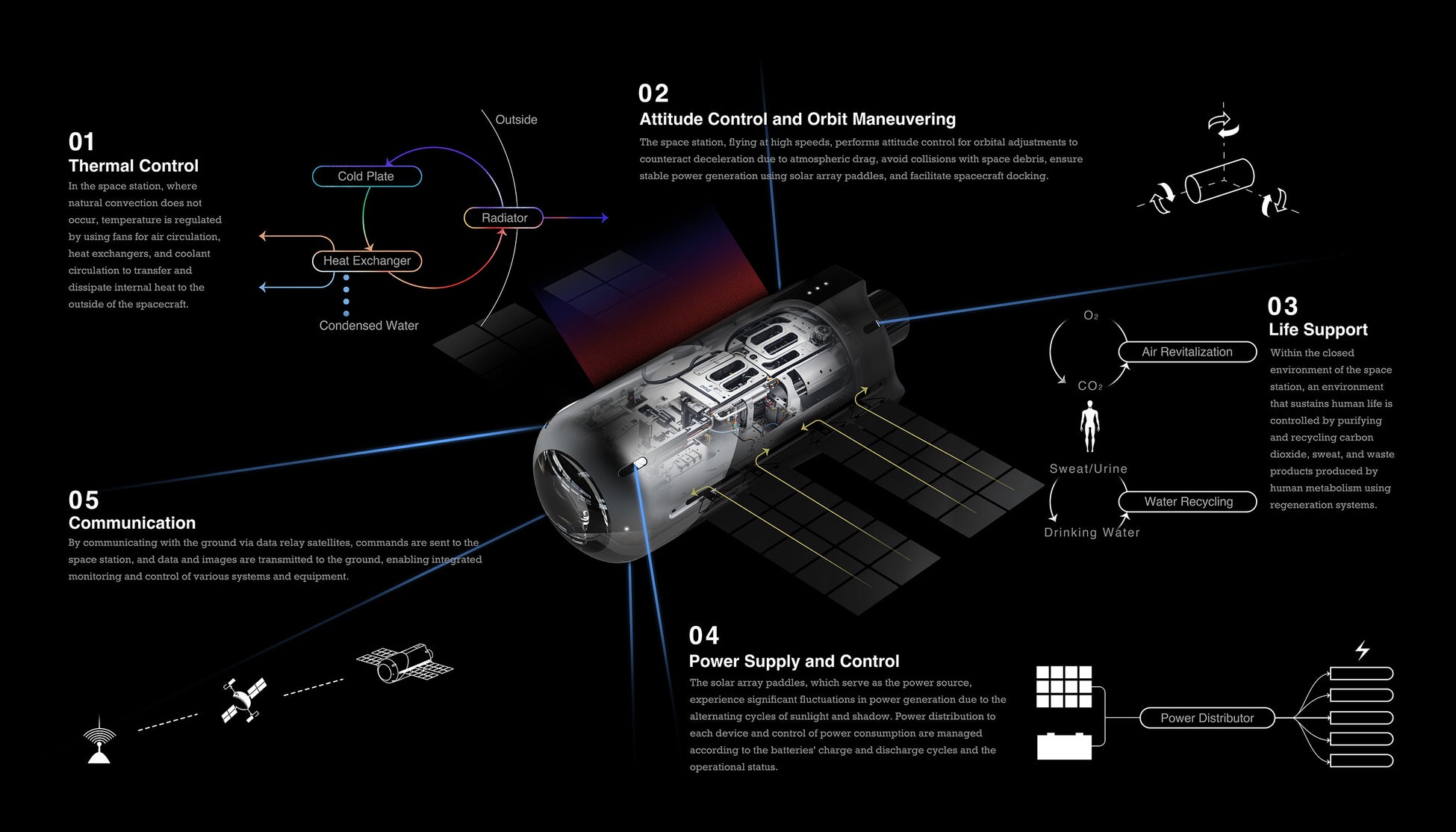 「Space Station OS」には宇宙ステーションを構成する、熱制御、姿勢制御、電力、熱、通信、生命維持などを制御するソフトウェアが搭載されています。また、各機能を統合し、システム全体の最適化を図る機能を備えています。
