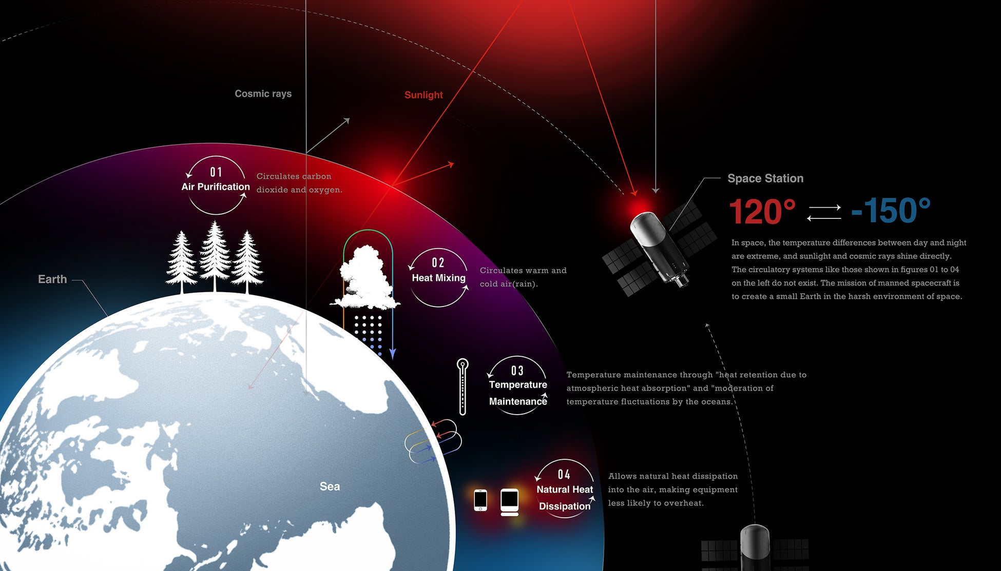 宇宙空間は、地球には当たり前にある空気や水、対流などの自然資源が無く、昼間は120度、夜には-150度に達する極端な温度環境にあります。また、強い宇宙放射線、無重力などの人にとって過酷な環境が広がっています。