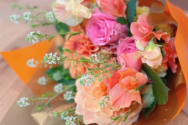 お祝いを華やかに演出するミニサイズの花束をプレゼント。