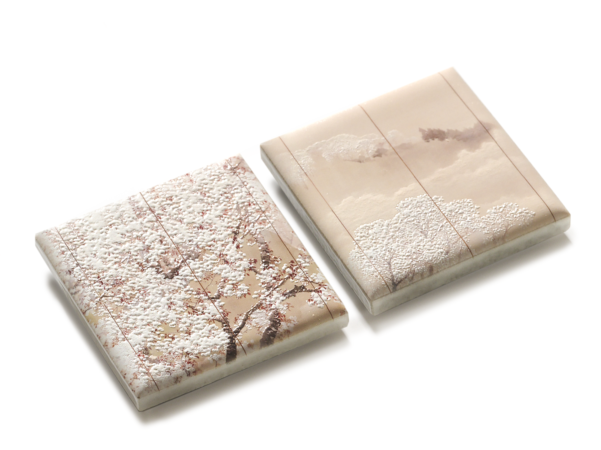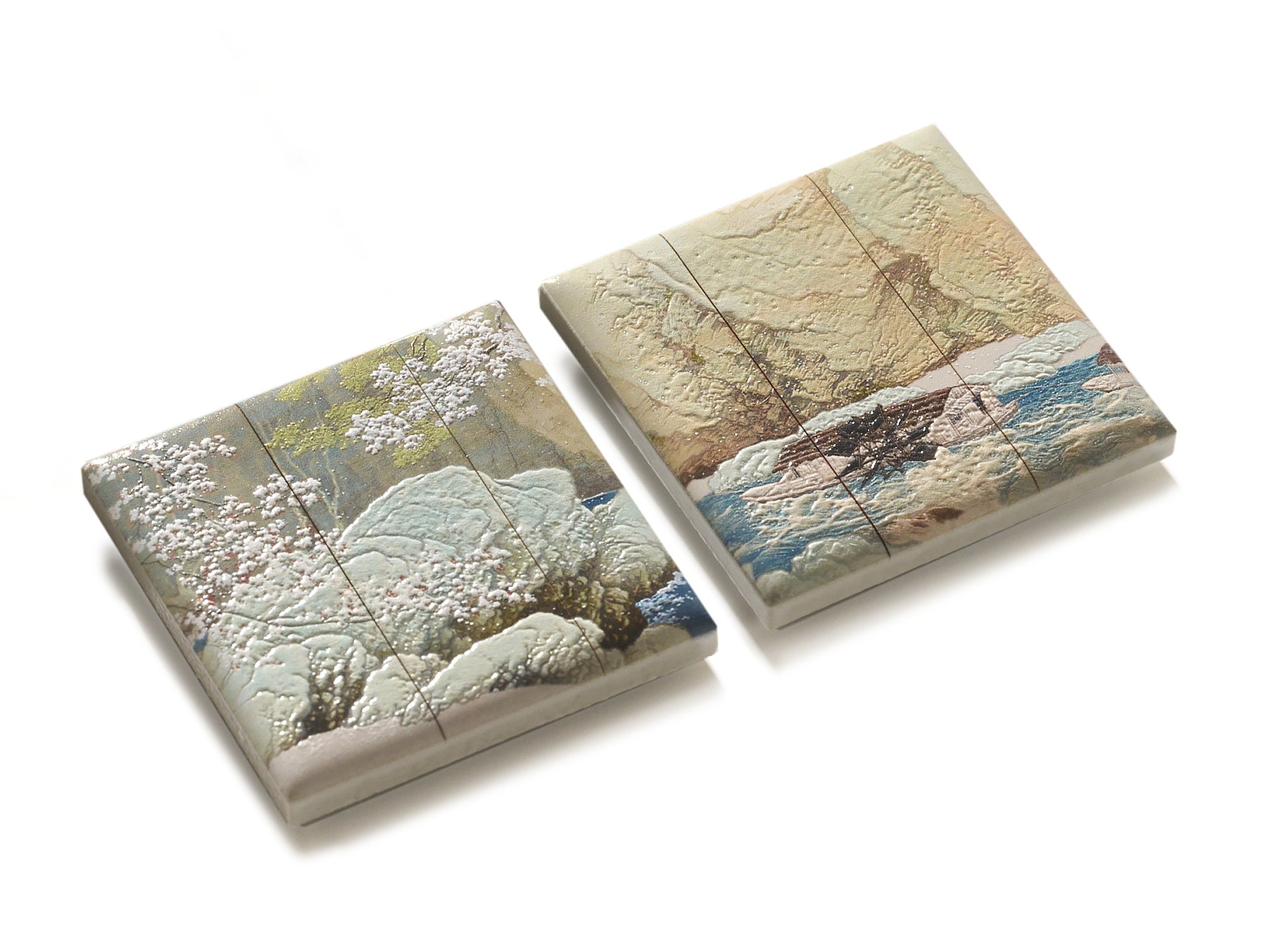 左隻の手前にある桜の木と岩に凹凸をつけながら、背景の岩壁はフラットにすることで遠近感を演出し、風景の奥行きを深めています。右隻に描かれている岩肌と波立つ川面にはグラデーション状の凹凸を加え、小さな点のように描かれている花弁にも立体加工を施すことで、自然が見せる豊かな表情をプラスしました。色調整にも細心の注意を払い、原画に近い色味の再現にもこだわっています。季節が移りゆく儚いワンシーンの中に迷い込むような、不思議な感覚を体験できるマグネットです。