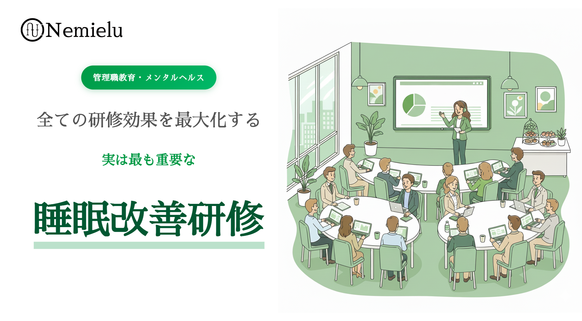 スリープテック事業を展開する株式会社ネミエル(本社:東京都新宿区、代表取締役CEO:松本光浩、以下「当社」)は、法人向け睡眠研修サービスをリニューアルいたします。研修の対象範囲を拡大するとともに、企業課題に応じたプログラム設計と、アプリを活用した継続フォローアップに対応いたしました。