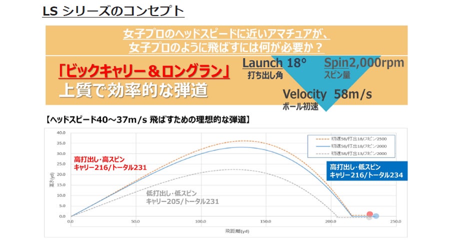(株)プロギアは、ヘッドスピード40m/s前後のゴルファーに向けた「LS(エルエス)」シリーズから「LS ドライバー」を5月19日から発売します。「ビッグキャリー&ロングラン」をコンセプトに、女子プロとヘッドスピードの近いアマチュアゴルファーが効率良く飛ばすために理想的な高打出しと低スピンを徹底的に追求しました。同様のコンセプトで女性の平均的なヘッドスピード30m/s前後のゴルファー向けに専用設計を施したレディースモデルもラインアップします。