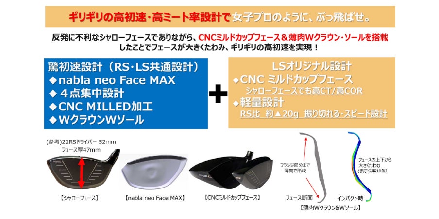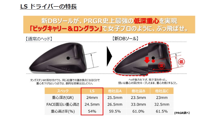 「LS ドライバー」は、ヘッド後方ソール部を下げることにより、重心の深さをキープしたまま、重心を低くすることができる「新DB(ディービィー)ソール」により、PRGR史上最強の低深重心を実現しています。これにより、ヘッドスピード40m/s前後のゴルファーがオートマティックに高打出し、低スピンで理想的な弾道のショットが打てるようにしています。さらに、高い初速性能にこだわる「RS」の設計技術を踏襲するとともに、専用設計の「CNCミルドカップフェース」と「薄肉Wクラウン・Wソール」がフェースを大きくたわませ、反発性能では不利なシャローフェースでありながらも"ギリギリ"の高初速を実現させました。また、「RS」より約20g軽い軽量設計で、やさしく振り切れるドライバーに仕上げています。