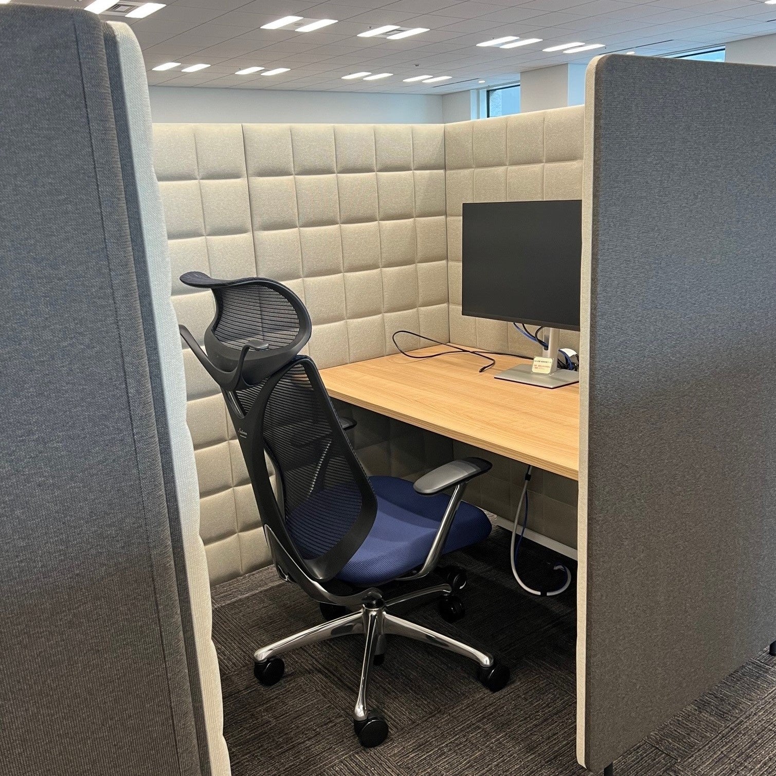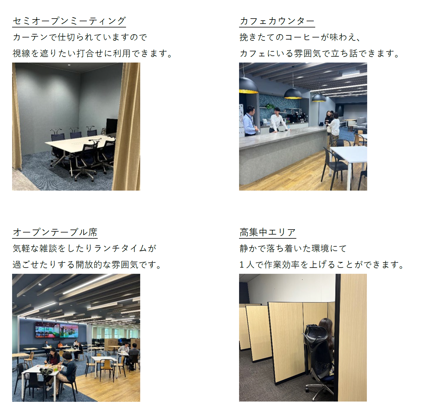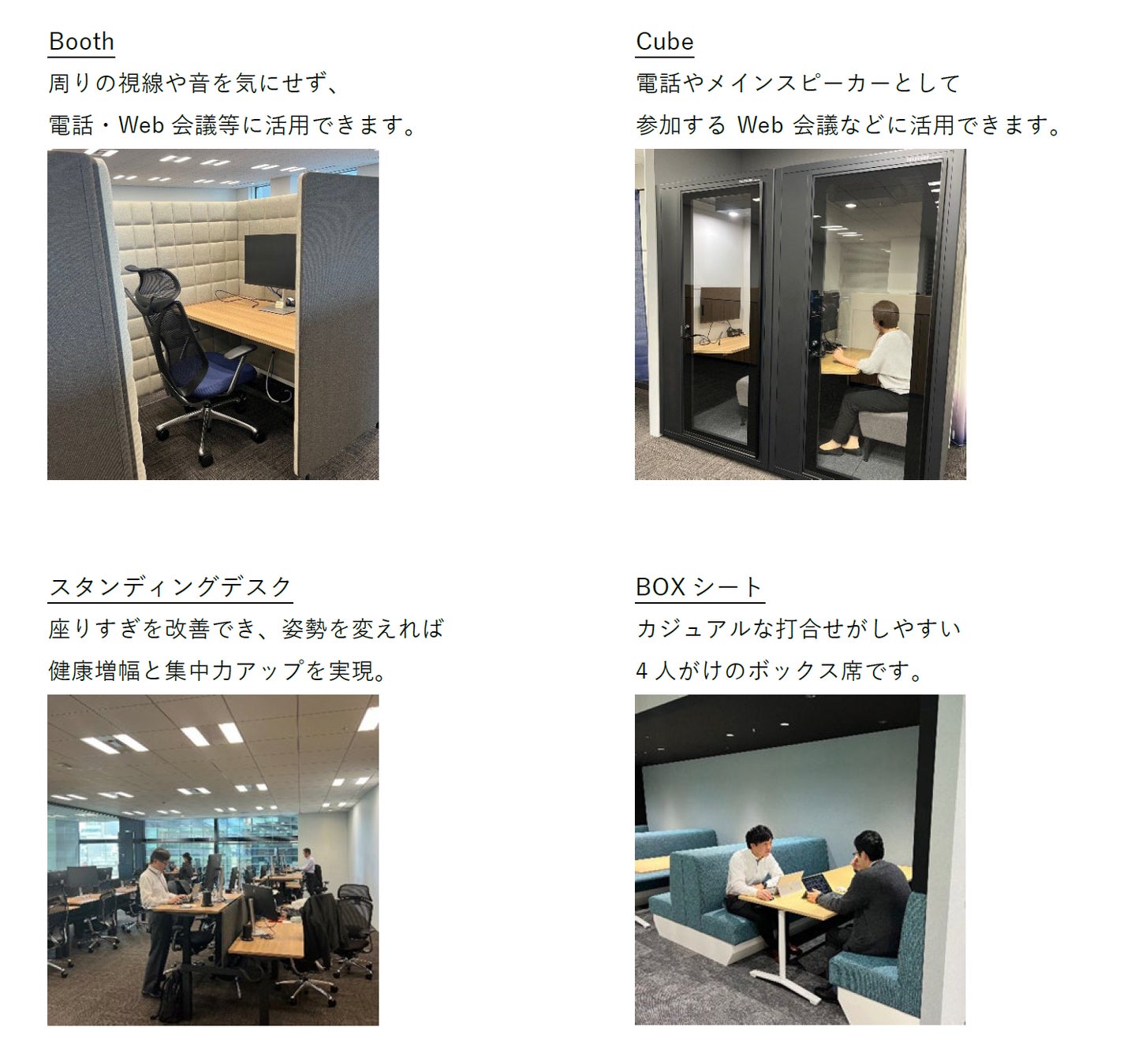 固定席を設けず、業務内容に適した場所・機能を、「高集中エリア」や「オープンデスク」「パネル付きオープンデスク」「Booth」「Cube」「Phone Booth」といった様々なタイプから選択し働くことができるオフィスになります。ケネディクスグループ社員が利用できる「ラウンジ」も設置し、ここでは気分を変えて作業したい時やケネディクスグループ社員同士が気軽に雑談して交流する時など、様々なシーンで利用できるよう設計しています。
