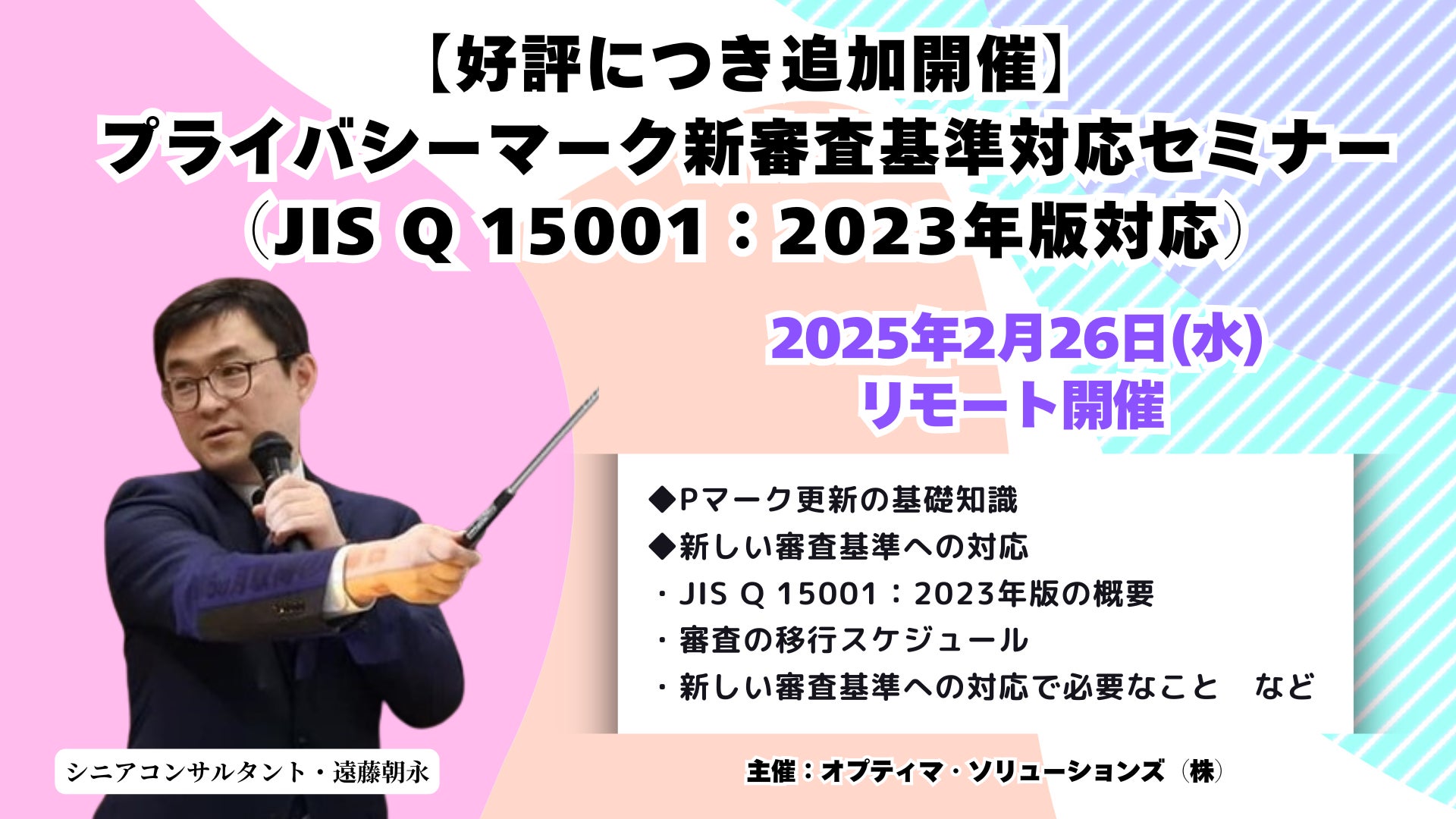 オプティマ・ソリューションズ株式会社(本社:東京都港区、代表:中康二)は、2025年2月26日(水)14時20分より、プライバシーマーク新審査基準対応セミナー(JIS Q 15001:2023年版対応)を無料開催します。リモートにてご参加いただけますのでお気軽にお申込みください。