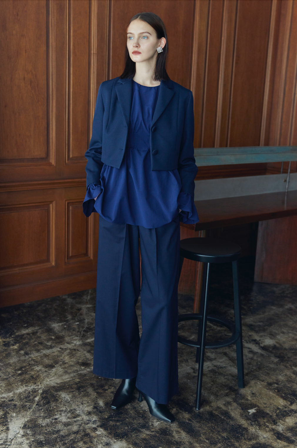 Noble short jacket(ノーブル ショート ジャケット)¥29,700-(税込)/Audire ruffle sleeve blouse (アウディーレ ラッフル スリーブ ブラウス)¥24,750-(税込)/Belted wide pants(ベルテッドワイドパンツ)¥23,100-(税込)