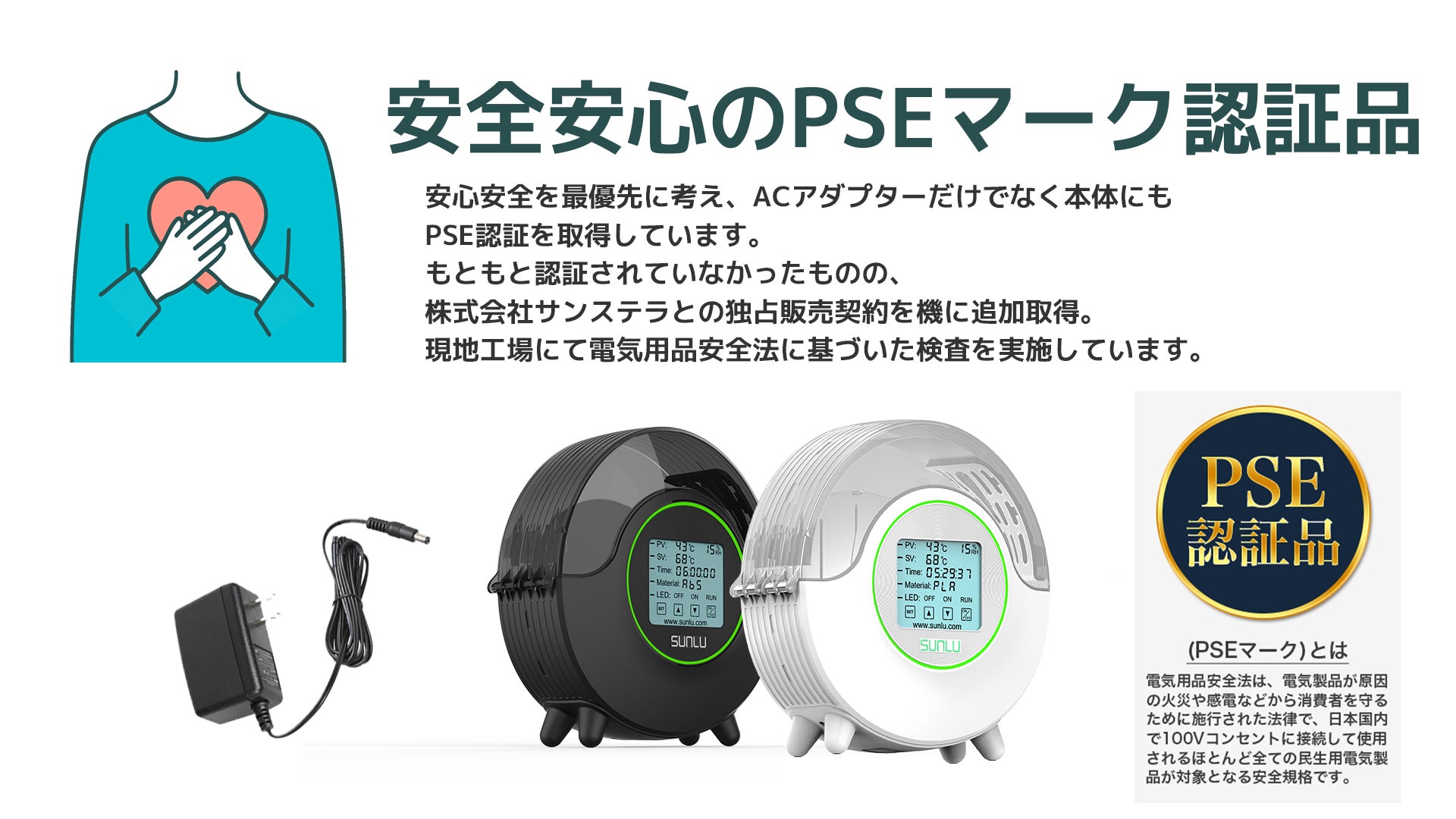 1巻入りのフィラメントドライボックスにおいて、本体にもPSE認証を取得した製品は、2022年5月現在、SUNLU FilaDryer S2が唯一となります。